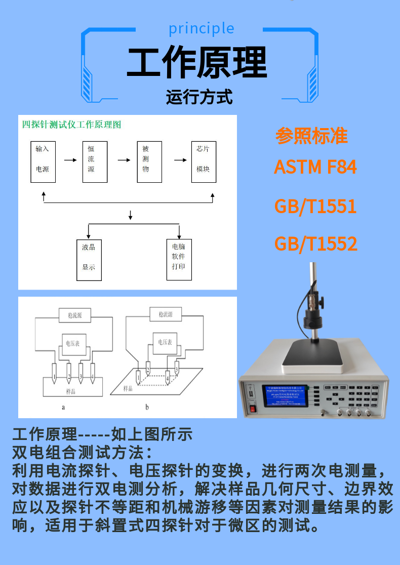 四探針測(cè)試儀是運(yùn)用四探針測(cè)量原理的多用途綜合測(cè)量設(shè)備,用來(lái)測(cè)試半導(dǎo)體材料電阻率及方塊電阻(薄層電阻)。儀器具有功能選擇直觀、測(cè)量取數(shù)快、精度高、測(cè)量范圍寬、穩(wěn)定性好、結(jié)構(gòu)緊湊、易操作等特點(diǎn)。