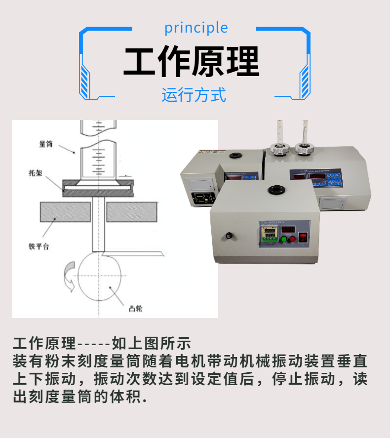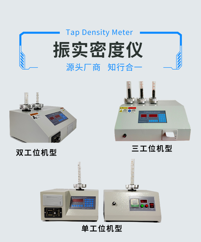 1.振實(shí)密度測(cè)定儀的工作方式:通過機(jī)械震動(dòng)的方式對(duì)裝有粉末樣品的量筒進(jìn)行固定頻率和振幅的敲擊,直至樣品在量筒中密實(shí)而不在下降為止,在通過密度計(jì)算公式,質(zhì)量與體積之比獲得.