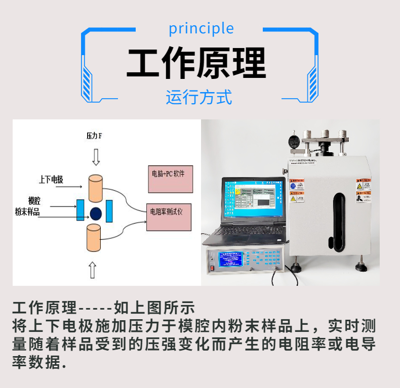 粉末電阻率測(cè)試儀的工作原理:將上下電極加壓于模腔內(nèi)粉末樣品上,實(shí)時(shí)測(cè)量隨著樣品受到的壓強(qiáng)變化而產(chǎn)生的電阻率或電導(dǎo)率數(shù)據(jù).
