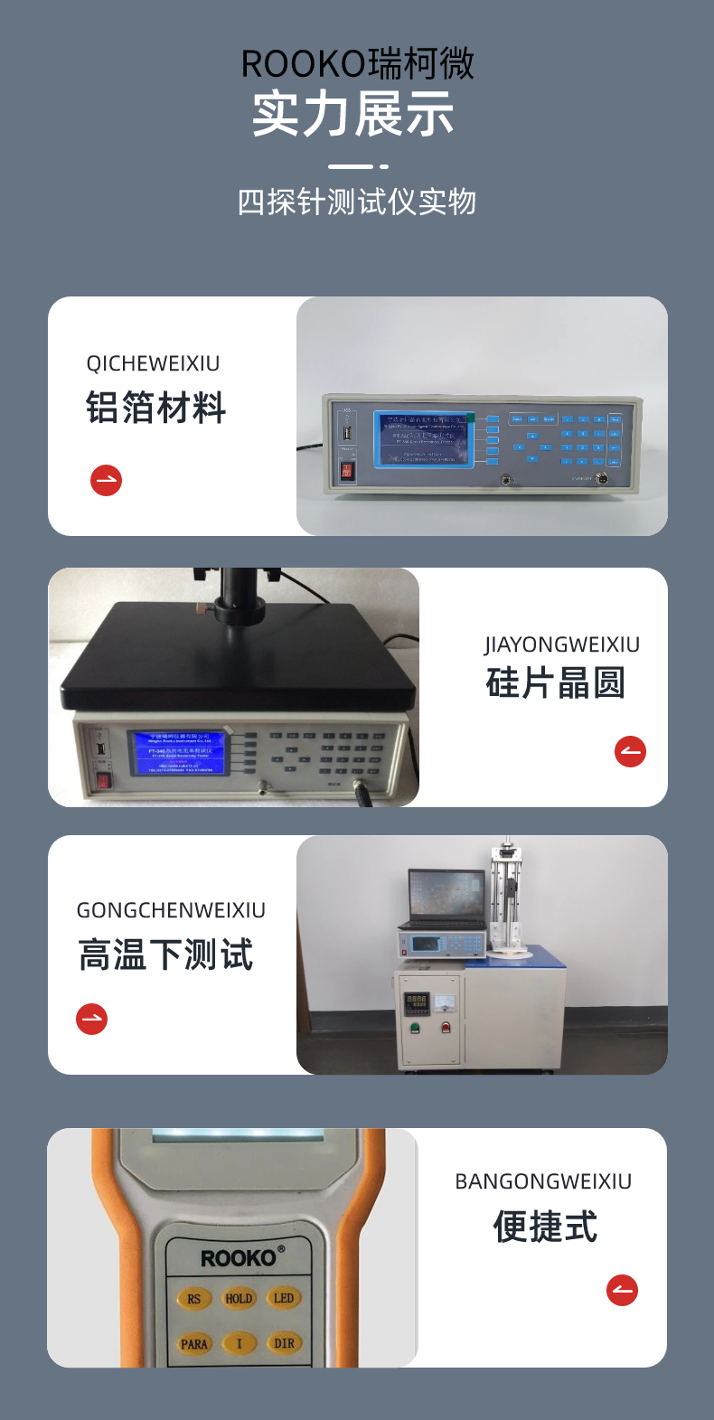 常用的接觸式測量半導(dǎo)體材料電阻率的方法主要有兩種:兩探針法和四探針法。兩探針法利用探針與體電阻直接接觸,避免了與測試電阻的接觸從而消除誤差。四探針法直線四探針法是用針距約為毫米的四根探針同時壓在樣品的平整表面上,利用恒流探針通以一個小電流,然后用高輸入阻抗的電位差計、電子毫伏計或數(shù)字電壓表測量電壓。利用高阻值電壓計測得探針間的電壓值,從而根據(jù)公式為探針系數(shù)是常數(shù),它可以測量樣品沿徑向分布的斷面電阻率
