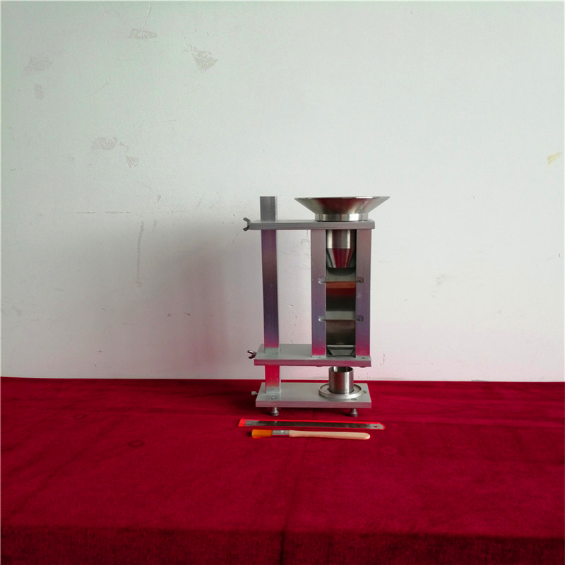 設備---裝置(圖1)頂部有一個具篩漏斗,其孔徑為1.00mm。漏斗安裝在一個由四塊玻璃擋板組成的折流箱上,樣品粉末流入時可以在這些玻璃擋板上滑動、抖動。折流箱的底部的漏斗用來收集樣品粉末,樣品粉末可以通過此漏斗直接流入到下面已知體積的接收杯中。接收杯可以是量筒(25.00 ± 0.05 ml、內徑30.00 ± 2.00 mm)或廣口杯(體積16.39 ± 0.2 ml,內徑25.400 ± 0.076 mm)