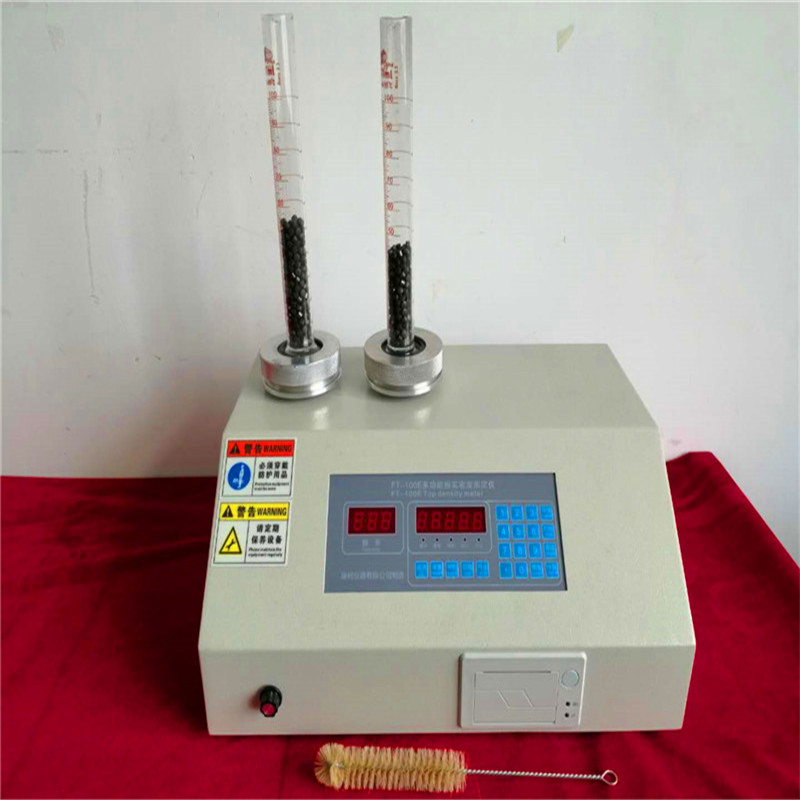 振實密度是在機械拍打裝有樣品粉末的容器后得到的一增大的堆積密度。振實密度是通過機械裝置拍打裝有樣品的量筒或容器得到。在記下最初的粉末體積或重量后,機械拍打量筒或容器,當體積或重量的變化非常小時記下讀數。機械拍打是指通過下述三種方法中的任一一種讓量筒或容器上升到規定的高度,然后自由落下。拍打過程中旋轉量筒是為了降低樣品的分離程度。