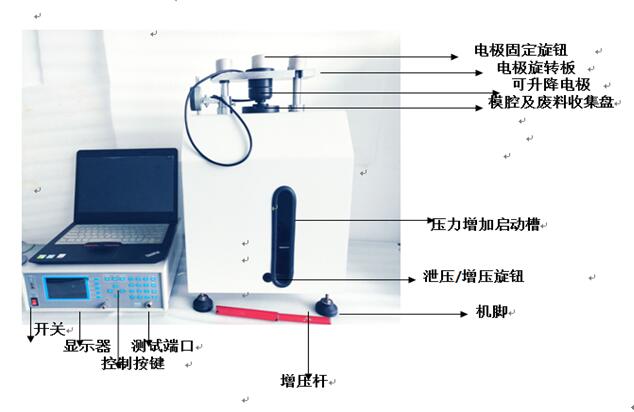 已知量的粉體,在液壓動力下壓縮體積至設定壓力值或壓強,在線測量粉體電阻、電阻率、電導率,并記錄數據.