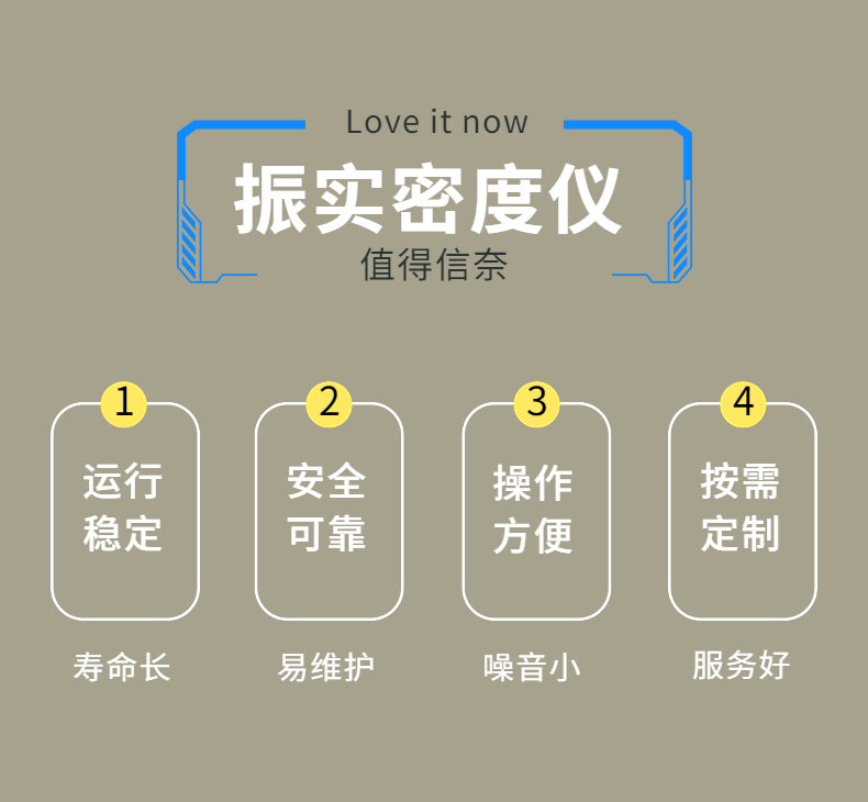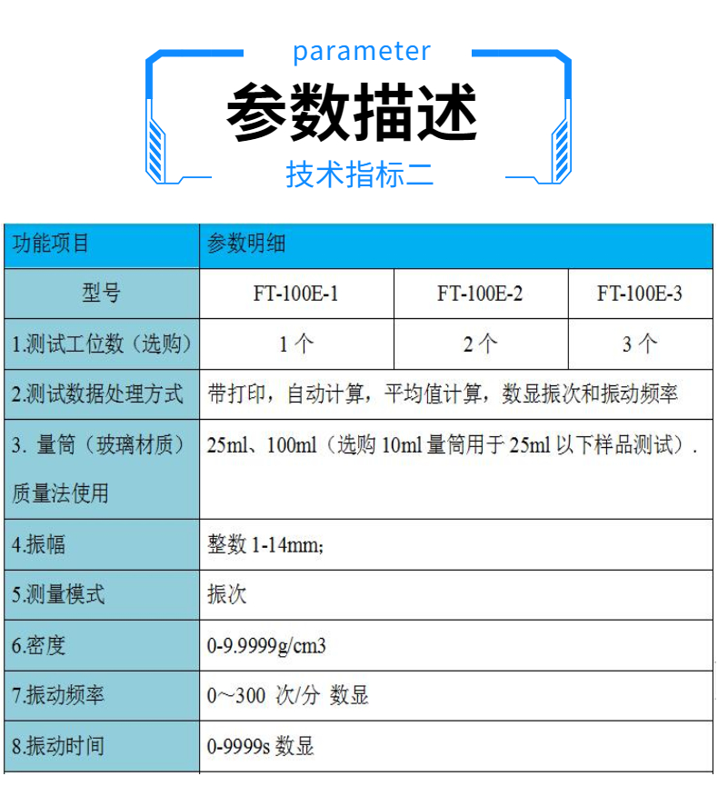 將粉末量筒固定在機械振動裝置上,振動電機帶動機械振動裝置上下振動,裝有粉末的刻度量筒隨機械振動裝置而發(fā)生有節(jié)拍的振動,隨著振動次數(shù)的增加,量筒里的粉末逐漸振實,振動次數(shù)到達設定的次數(shù)后,機械振動裝置停止振動,讀出刻度試管的體積,根據(jù)密度的定義:質量除以體積、從而求出振實后的粉末密度。